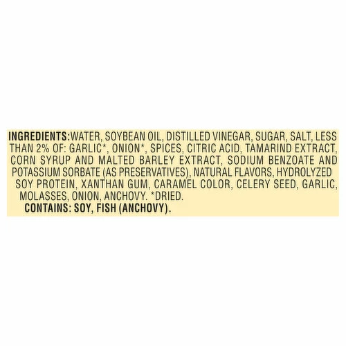 Water, Soybean Oil, Distilled Vinegar, Sugar, Salt, Less than 2% of: Garlic (Dried), Onion (Dried), Spices, Citric Acid, Tamarind Extract, Corn Syrup and Malted Barley Extract, Sodium Benzoate and Potassium Sorbate (as Preservatives), Natural Flavors, Hydrolyzed Soy Protein, Xanthan Gum, Caramel Color, Celery Seed, Garlic, Molasses, Onion, Anchovy.