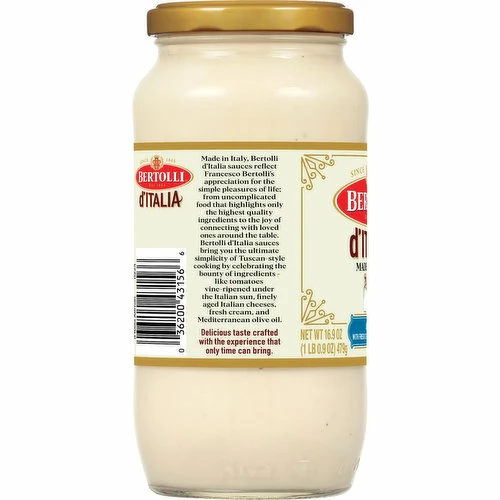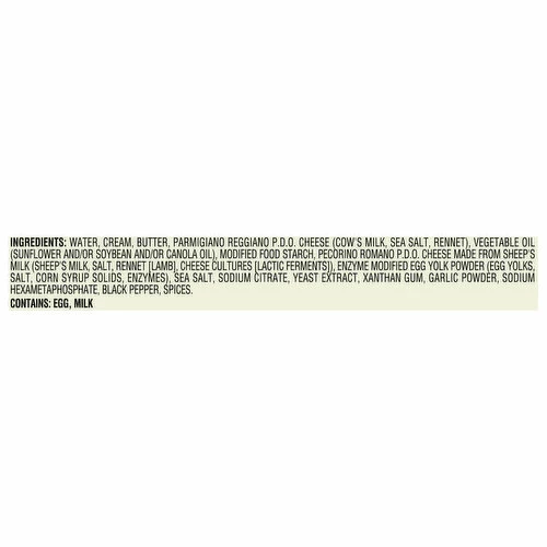 Water, Cream, Butter, Parmigiano Reggiano PDO Cheese (Milk, Sea Salt, Enzyme), Sunflower Oil, Modified Corn Starch, Pecorino Romano PDO Cheese Made from Sheep’s Milk (Sheep’s Milk, Salt, Enzyme), Egg Yolk Powder (Dried Egg Yolks, Salt, Corn Syrup), Salt, Sodium Citrate, Yeast Extract, Xanthan Gum, Garlic Powder, Sodium Phosphate, Spices.