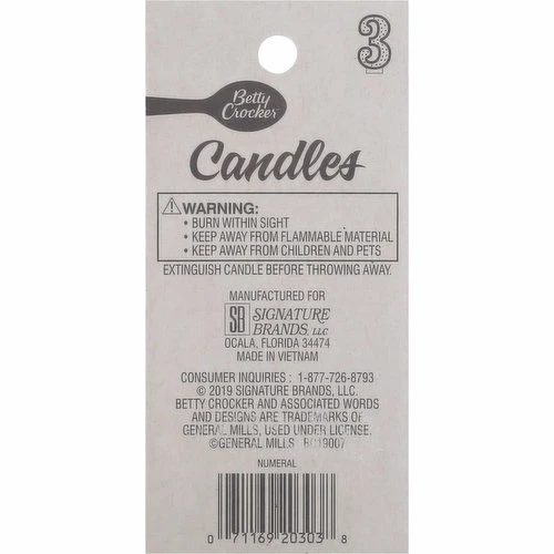 Betty Crocker Birthday Candle, Numeral 3, 3 Inch, 1 Each