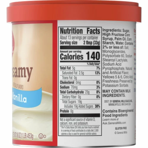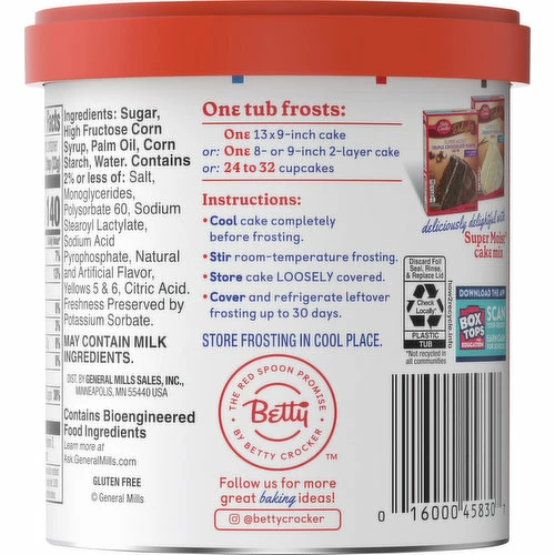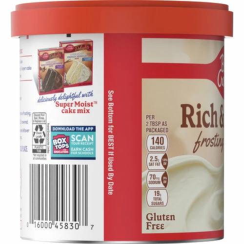 How will you enjoy the rich, decadent flavor of our creamy and delicious frosting? Betty Crocker Gluten Free Vanilla Flavored Frosting perfectly tops all your cakes, cupcakes and cookies for the whole family to enjoy. Just pop open the can, spread the frosting and share! Instant gluten-free gratification!For more than a century, Betty Crocker has been a popular creator of easy, delicious recipes. Today, the Betty Crocker kitchen is still providing convenient, tasty dessert mixes, frostings, and convenient meal options and side dishes. And today, you can still find that same simple goodness — those same products you grew up with — on grocery shelves around the world.