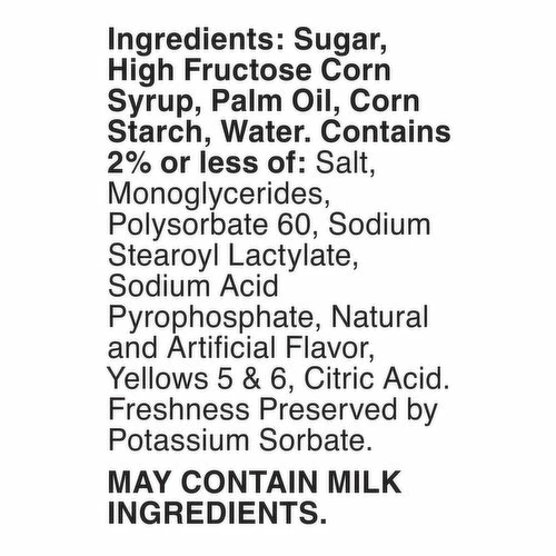 Sugar, High Fructose Corn Syrup, Palm Oil, Corn Starch, Water, Contains 2% or Less of: Salt, Monoglycerides, Polysorbate 60, Sodium Stearoyl Lactylate, Sodium Acid Pyrophosphate, Natural and Artificial Flavor, Yellows 5 & 6, Citric Acid, Freshness Preserved by Potassium Sorbate.