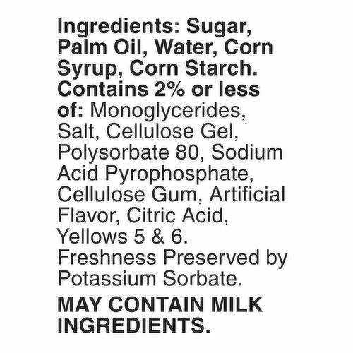 Sugar, Palm Oil, Water, Corn Syrup, Corn Starch, Contains 2% of Less of: Monoglycerides, Salt, Cellulose Gel, Polysorbate 80, Sodium Acid Pyrophosphate, Cellulose Gum, Artificial Flavor, Citric Acid, Yellows 5 & 6, Freshness Preserved by Potassium Sorbate.