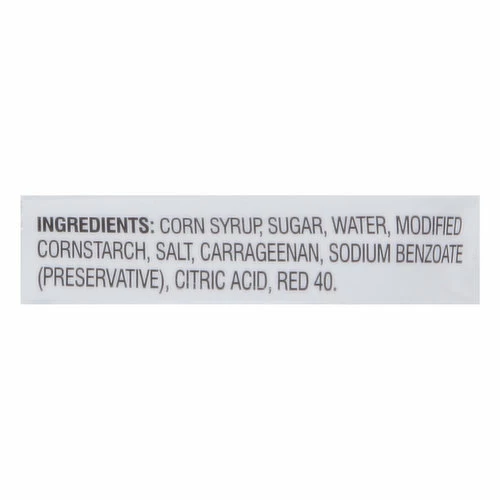 Corn Syrup, Sugar, Water, Modified Cornstarch, Salt, Carrageenan, Sodium Benzoate (Preservative), Citric Acid, Red 40.