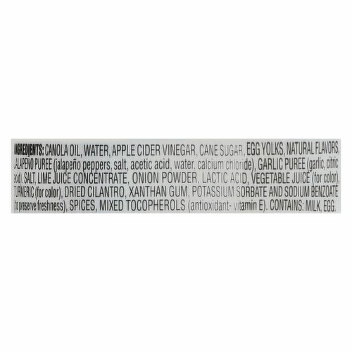 Canola Oil, Water, Apple Cider Vinegar, Sugar, Egg Yolks, Natural Flavors, Jalapeno Puree (Jalapeno Peppers, Salt, Acetic Acid, Water, Calcium Chloride), Garlic Puree (Garlic, Citric Acid), Salt, Lime Juice Concentrate, Onion Powder, Lactic Acid, Vegetable Juice (for Color), Turmeric (for Color), Dried Cilantro, Xanthan Gum, Potassium Sorbate and Sodium Benzoate (to Preserve Freshness), Spices, Mixed Tocopherols (Antioxidant – Vitamin E).