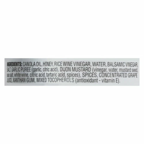 Canola Oil, Honey, Rice Wine Vinegar, Water, Balsamic Vinegar, Salt, Garlic Puree (Garlic, Citric Acid), Dijon Mustard (Vinegar, Water, Mustard Seed, Sea Salt, White Wine, Citric Acid Tartaric Acid, Spices), Spices, Concentrated Grape Juice, Xanthan Gum, Mixed Tocopherols (Antioxidant – Vitamin E).