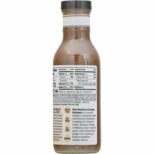Dress your salad in good taste! New American Creamy Balsamic is a creamy balsamic vinaigrette made with flavorful ingredients including U.S. Grade A honey, Balsamic Vinegar of Modena, Dijon mustard, garlic, and cracked black pepper. It’s a delicious blend of signature culinary flavors. Go Texan. Small Batch Since 1982 Briannas Fine Salad Dressings grew out of a desire to create superior lasting salad dressings. This homestyle approach starts with using the finest, high quality ingredients and blending each dressing recipe exclusively in small batches.