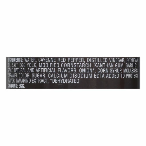 Water, Cayenne Red Pepper, Distilled Vinegar, Soybean Oil, Salt, Egg Yolk, Modified Cornstarch, Xanthan Gum, Garlic (Dehydrated), Spice, Natural and Artificial Flavors, Onion (Dehydrated), Corn Syrup, Molasses, Caramel Color, Sugar, Calcium Disodium EDTA Added to Protect Flavor, Tamarind Extract.
