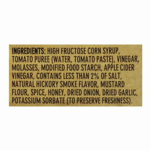 High Fructose Corn Syrup, Tomato Puree (Water, Tomato Paste), Vinegar, Molasses, Modified Food Starch, Apple Cider Vinegar, Contains Less than 2% of Salt, Natural Hickory Smoke Flavor, Mustard Flour, Spice, Honey, Dried Onion, Dried Garlic, Potassium Sorbate (to Preserve Freshness).