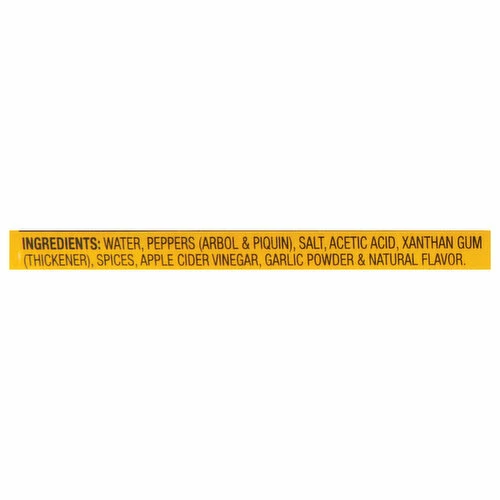 Water, Peppers (Arbol & Piquin), Salt, Acetic Acid, Xanthan Gum (Thickener), Spices, Apple Cider Vinegar, Garlic Powder & Natural Flavor.