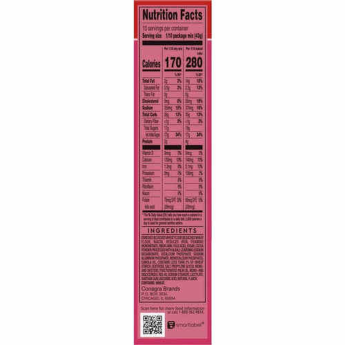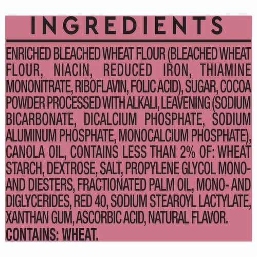 Enriched Bleached Wheat Flour (Bleached Wheat Flour, Niacin, Reduced Iron, Thiamine Mononitrate, Riboflavin, Folic Acid), Sugar, Cocoa Powder Processed with Alkali, Leavening (Sodium Bicarbonate, Dicalcium Phosphate, Sodium Aluminum Phosphate, Monocalcium Phosphate), Canola Oil, Contains Less than 2% of: Wheat Starch, Dextrose, Salt, Propylene Glycol Mono-and Diesters, Fractionated Palm Oil, Mono- and Diglycerides, Red 40, Sodium Stearoyl Lactylate, Xanthan Gum, Ascorbic Acid, Natural Flavor.
