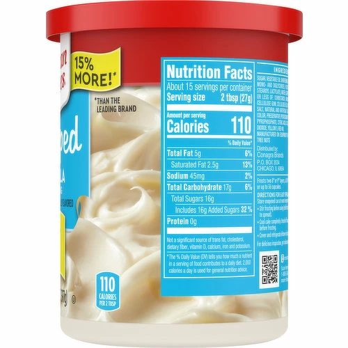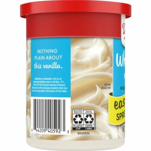 Duncan Hines Whipped Vanilla Frosting gives your cakes, cupcakes and brownies a decadent topping to make them special. Classic vanilla flavor pairs well with all your favorite baked goods, and the whipped frosting texture makes this white frosting easy to spread. Use it as birthday cake frosting to create a white background for the decorations, or turn your everyday brownies into a special treat with this dessert topping. Each 14 ounce can frosts two 8″ or 9″ cake layers, a 13×9″ cake or brownies, or up to 36 cupcakes. Store the reclosable can at room temperature, stirring before use. Cover any remaining frosting and store in the refrigerator for up to 30 days. From whipped frosting, to single serve desserts, Duncan Hines has you covered when you’re ready to bake and create.