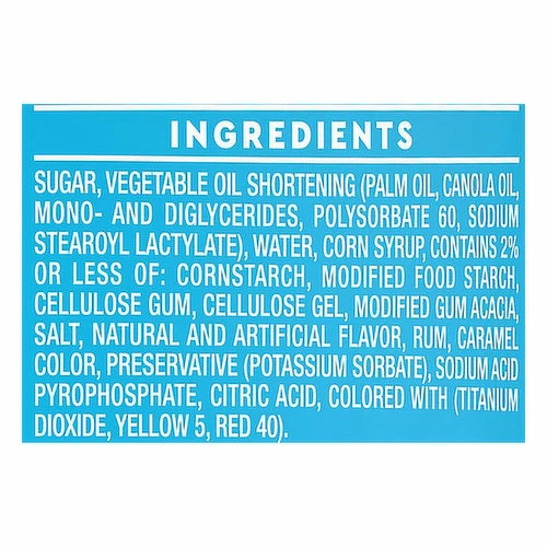 Sugar, Vegetable Oil Shortening (Palm Oil, Canola Oil, Mono- and Diglycerides, Polysorbate 60, Sodium Stearoyl Lactylate), Water, Corn Syrup, Contains 2% or Less of: Cornstarch, Modified Food Starch, Cellulose Gum, Cellulose Gel, Modified Gum Acacia, Salt, Natural and Artificial Flavor, Rum, Caramel Color, Preservative (Potassium Sorbate), Sodium Acid Pyrophosphate, Citric Acid, Colored with (Titanium Dioxide, Yellow 5, Red 40).