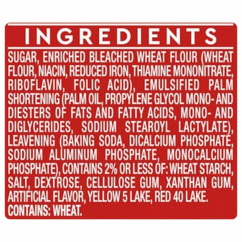Sugar, Enriched Bleached Wheat Flour (Wheat Flour, Niacin, Reduced Iron, Thiamine Mononitrate, Riboflavin, Folic Acid), Emulsified Palm Shortening (Palm Oil, Propylene Glycol Mono- and Diesters of Fats and Fatty Acids, Mono- and Diglycerides, Sodium Stearoyl Lactylate), Leavening (Baking Soda, Dicalcium Phosphate, Sodium Aluminum Phosphate, Monocalcium Phosphate), Contains 2% or Less of: Wheat Starch, Salt, Dextrose, Cellulose Gum, Xanthan Gum, Artificial Flavor, Yellow 5 Lake, Red 40 Lake.