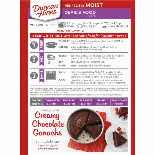 Celebrating is simple with Duncan Hines Perfectly Moist Devil’s Food Cake Mix. Rich chocolate flavor and a moist crumb helps you create the kind of chocolate dessert your family loves. With Duncan Hines, your creativity is the spark for delicious baking, from cake pops to chocolate cupcakes. Just add water, eggs and vegetable oil to this devil’s food chocolate cake mix. Beat the batter and pour into your preferred pan size, baking for up to 36 minutes. This boxed cake mix makes one 9 inch layer cake or 24 cupcakes. From rich chocolate cake to single serve desserts, Duncan Hines has you covered when you’re ready to bake and create.