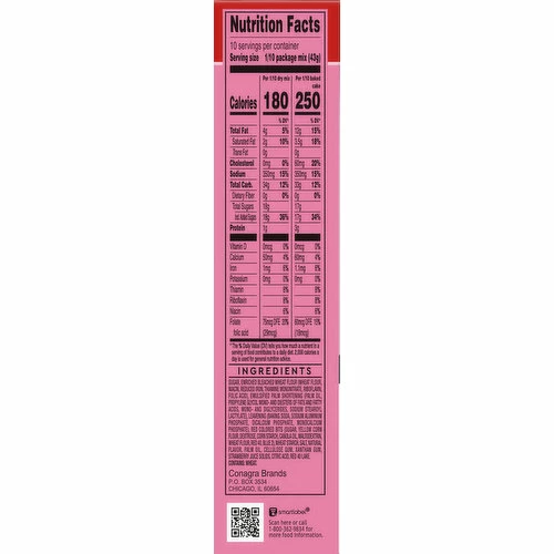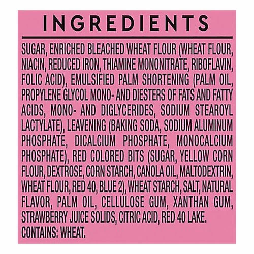 Sugar, Enriched Bleached Wheat Flour (Wheat Flour, Wheat Starch, Niacin, Reduced Iron, Thiamine Mononitrate, Riboflavin, Folic Acid), Emulsified Palm Shortening (Palm Oil, Propylene Glycol Mono- and Diesters of Fats and Fatty Acids, Mono- and Diglycerides, Sodium Stearoyl Lactylate), Leavening (Baking Soda, Sodium Aluminum Phosphate, Dicalcium Phosphate, Monocalcium Phosphate), Red Colored Bits (Sugar, Yellow Corn Flour, Dextrose, Corn Starch, Canola Oil, Maltodextrin, Wheat Flour, Red 40, Blue 2), Wheat Starch, Salt, Natural Flavor, Palm Oil, Cellulose Gum, Xanthan Gum, Strawberry Juice Solids, Citric Acid, Red 40 Lake.