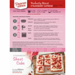 Savor the invigorating flavor of Duncan Hines Signature Perfectly Moist Strawberry Supreme Naturally Flavored Cake Mix in an easy strawberry dessert with easy prep. Made with juice from strawberries, this boxed cake mix satisfies your cravings for a fruity dessert. Bake a layer cake, sheet cake or strawberry cupcakes to celebrate all of life’s occasions. Simply stir in water, eggs and vegetable oil to create smooth, velvety batter and bake up to 36 minutes depending on your pan choice. This 15.25 ounce strawberry cake mix makes enough for a 13 by 9 inch cake pan or 24 cupcakes. From decadent brownie mix, to single serve desserts, Duncan Hines has you covered when you’re ready to bake and create.
