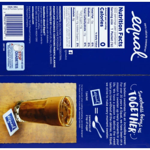 1 packet = sweetness of 2 tsp of sugar. Sweetness bring us together. Suitable for individuals with diabetes. We believe sweetness has an incredible power. For over 30 years at Equal, we have been on a mission to sweeten up many moments in your life. We have a passion to deliver the sweet taste you love without all the calories. At Equal, we strive to make every moment sweeter. Facebook. Questions about Equal? Call toll-free 1-800-323-5316, or write to Equal Consumer Affairs, Box 1280, South Bend, IN 46624-1280. www.equal.com. Together we can stop diabetes. American Diabetes Association. Equal is proud to support the Stop Diabetes movement.