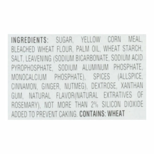 Sugar, Yellow Corn Meal, Bleached Wheat Flour, Palm Oil, Wheat Starch, Salt, Leavening (Sodium Bicarbonate, Sodium Acid Pyrophosphate, Sodium Aluminum Phosphate), Spices (Allspice, Cinnamon, Ginger, Nutmeg), Dextrose, Xanthan Gum, Natural Flavor (Natural Extratives of Rosemary), Not More than 2% Silicon Dioxide Added to Prevent Caking.