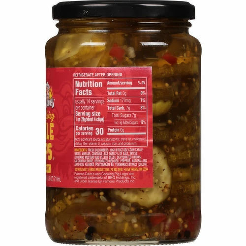 Fresh Cucumbers, High Fructose Corn Syrup, Water, Vinegar, Contains Less than 2% of Salt, Spices (Contains Mustard and Celery Seed), Dehydrated Onions, Calcium Chloride, Dehydrated Red Bell Peppers, Natural and Artificial Flavors, Polysorbate 80, Turmeric Extract (Color).