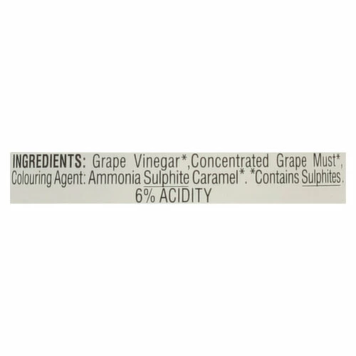 Grape Vinegar (Contains Sulphites), Concentrated Grape Must (Contains Sulphites) Colouring Agent: Ammonia Sulphite Caramel (Contains Sulphites).