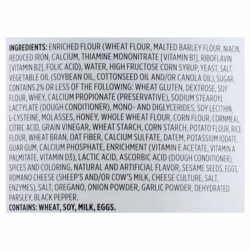 Enriched Flour (Wheat Flour, Malted Barley Flour, Niacin, Reduced Iron, Calcium, Thiamine Mononitrate (Vitamin B2, Riboflavin [Vitamin B21, Folic Acid), Water, High Fructose Corn Syrup, Yeast, Salt, Vegetable Oil (Soybean Oil, Cottonseed Oil and/or Canola Oil), Sugar, Contains 2% or Less of the Following: Wheat Gluten, Dextrose, Soy Flour, Whey, Calcium Propionate (Preservative), Sodium Stearoyl Lactylate (Dough Conditioner), Mono- and Diglycerides, Soy Lecithin, L-Cysteine, Molasses, Honey, Whole Wheat Flour, Corn Flour, Cornmeal Citric Acid, Grain Vinegar, Wheat Starch, Corn Starch, Potato Flour, Rice Flour, Wheat Bran, Oat Fiber, Calcium Sulfate, DATEM, Potassium Iodate, Guar Gum, Calcium Phosphate, Enrichment (Vitamin E Acetate, Vitamin A Palmitate, Vitamin D3), Lactic Acid, Ascorbic Acid (Dough Conditioner), Spices and Coloring, Natural and Artificial Flavor, Sesame Seeds, Eggs, Romano Cheese (Sheep’s and/or Cow’s Milk, Cheese Culture, Salt, Enzymes), Salt, Oregano, Onion Powder, Garlic Powder, Dehydrated Parsley, Black Pepper.