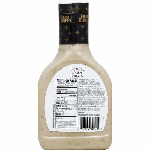 Water, Vegetable Oil (Soybean Oil and/or Canola Oil) Distilled Vinegar, Egg Yolks, Parmesan and Romano Cheeses (Pasteurized Cow’s Milk, Salt, Culture, Enzymes), Salt, High Fructose Corn Syrup, Less than 2%: Modified Corn Starch, Buttermilk, Garlic (Dried), Anchovies, Spices, Phosphoric Acid, Monosodium Glutamate, Lemon Juice Concentrate, Onion (Dried), Xanthan Gum, Propylene Glycol Alginate, Citric Acid, Cheddar Cheese (Dried), Natural and Artificial Flavor, Disodium Inosinate, Disodium Guanylate, Potassium Sorbate (Preservative), Worcestershire Sauce (Distilled Vinegar, Molasses, Corn Syrup, Water, Garlic (Dried), Salt, Sugar Spices, Tamarind, Natural Flavor), Caramel Color.