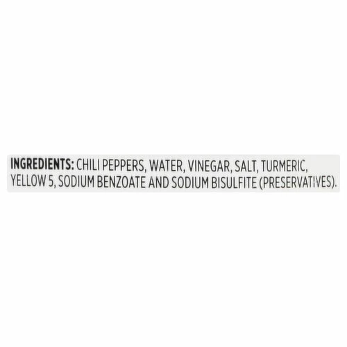 Chili Peppers, Water, Vinegar, Salt, Turmeric, Yellow 5, Sodium Benzoate and Sodium Bisulfite (Preservatives).