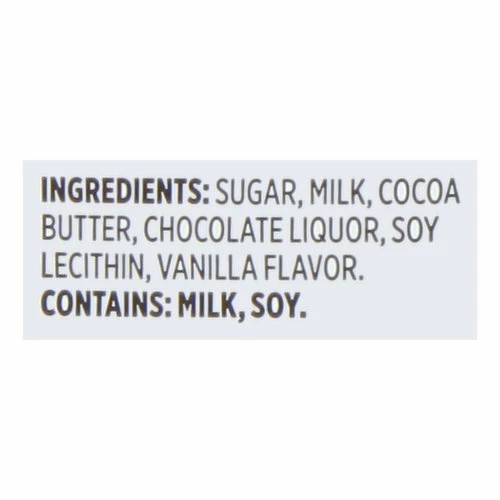 Sugar, Milk, Cocoa Butter, Chocolate Liquor, Soy Lecithin, Vanilla Flavor.