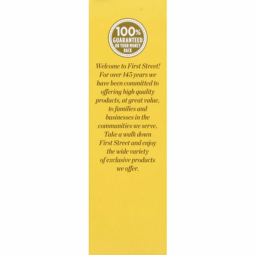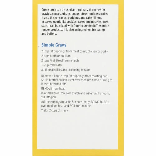 Gluten free. Vegan. Since 1871. For thickening sauces & gravies. Corn starch can be used as a culinary thickener for gravies, sauces, glazes, soups, stews and casseroles. It also thickens pies, puddings and cake fillings. In baked goods like cookies, cakes and pastries, corn starch can be mixed with flour to create fluffier, more tender products. It is also an ingredient in coating and batters. Welcome to First Street! For over 145 years we have been committed to offering high quality products, at great value, to families and businesses in the communities we serve. Take a walk down First Street and enjoy the wide variety of exclusive products we offer. 100% guaranteed or your money back.