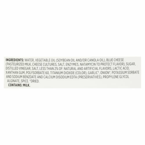 Water, Vegetable Oil (Soybean Oil and/or Canola Oil), Blue Cheese (Pasteurized Milk, Cheese Cultures, Salt, Enzymes, Natamycin to Protect Flavor), Sugar, Distilled Vinegar, Salt, Less than 2% of: Natural and Artificial Flavors, Lactic Acid, Xanthan Gum, Polysorbate 60, Titanium Dioxide (Color), Garlic (Dried), Onion (Dried), Potassium Sorbate and Sodium Benzoate and Calcium Disodium EDTA (Preservatives), Propylene Glycol Alginate, Spice.