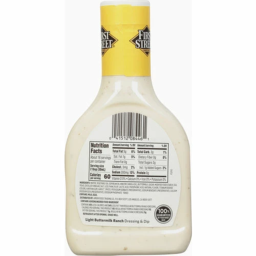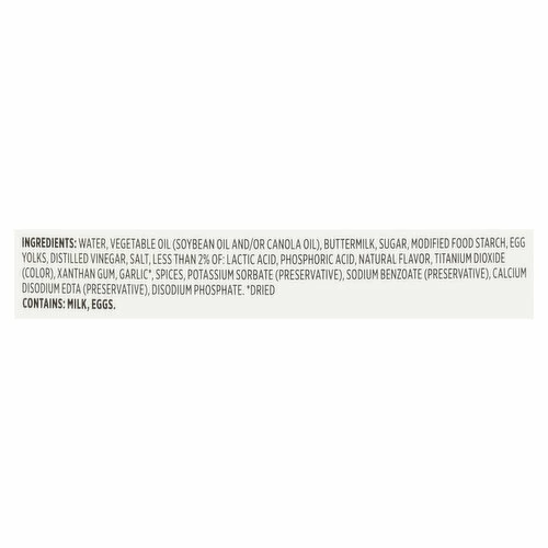 Water, Vegetable Oil (Soybean Oil and/or Canola Oil), Buttermilk, Sugar, Modified Food Starch, Egg Yolks, Distilled Vinegar, Salt, Less than 2% of: Lactic Acid, Phosphoric Acid, Natural Flavor, Titanium Dioxide (Color), Xanthan Gum, Garlic (Dried), Spices, Potassium Sorbate (Preservative), Sodium Benzoate (Preservative), Calcium Disodium EDTA (Preservative), Disodium Phosphate.