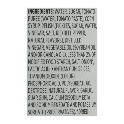 Water, Sugar, Tomato Puree (Water, Tomato Paste), Corn Syrup, Relish (Pickles, Sugar, Water, Vinegar, Salt, Red Bell Pepper, Natural Flavors), Distilled Vinegar, Vegetable Oil (Soybean Oil and/or Canola Oil), Less than 2% of: Modified Food Starch, Salt, Onion (Dried), Lactic Acid, Xanthan Gum, Spices, Titanium Dioxide (Color), Phosphoric Acid, Polysorbate 60, Dextrose, Natural Flavor, Garlic, Guar Gum, Calcium Disodium EDTA and Sodium Benzoate and Potassium Sorbate (Preservatives).