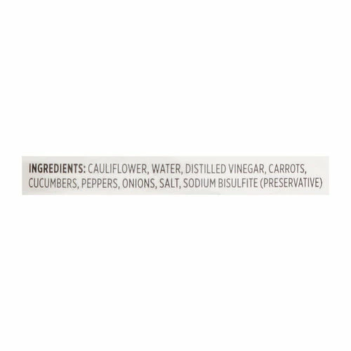 Cauliflower, Water, Distilled Vinegar, Carrots, Cucumbers, Peppers, Onions, Salt, Sodium Bisulfite (Preservative).