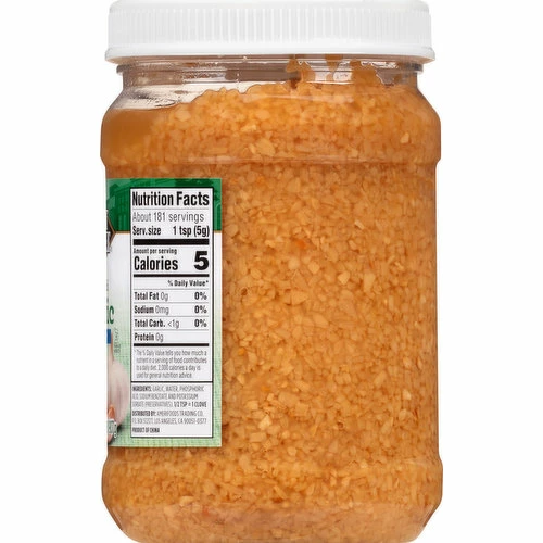 Garlic, Water, Phosphoric Acid, Sodium Benzoate and Potassium Sorbate (Preservatives), 1/2 Tsp=1 Clove.