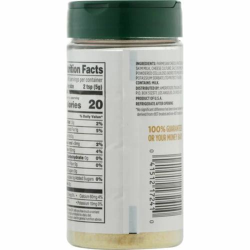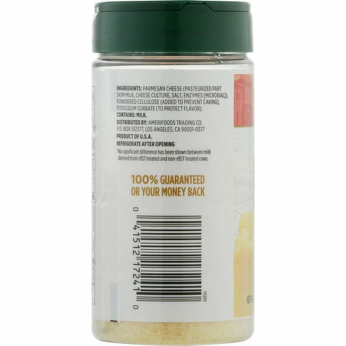 Parmesan Cheese (Pasteurized Part Skim Milk, Cheese Culture, Salt, Enzymes [Microbial]), Powdered Cellulose (Added to Prevent Caking), Potassium Sorbate (to Protect Flavor).