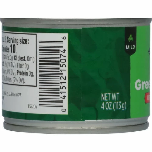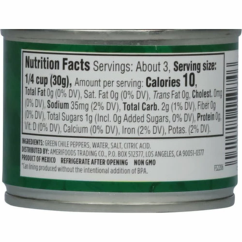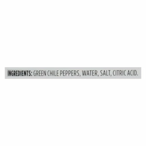 Green Chile Peppers, Water, Salt, Citric Acid.