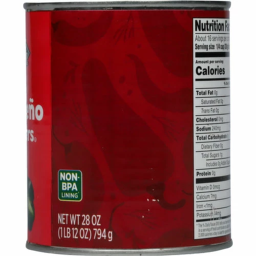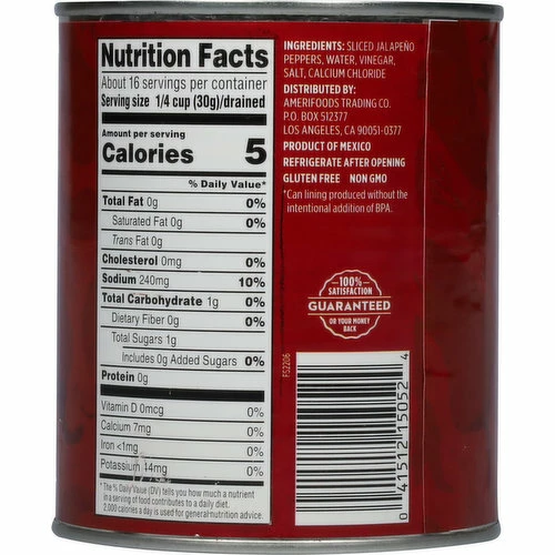 Sliced Jalapeno Peppers, Water, Vinegar, Salt, Calcium Chloride.