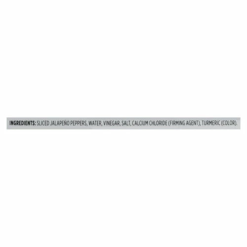 Sliced Jalapeno Peppers, Water, Vinegar, Salt, Calcium Chloride (Firming Agent), Turmeric (Color).