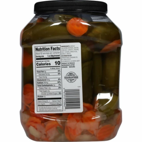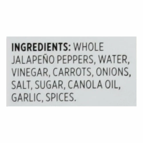 Whole Jalapeno Peppers, Water, Vinegar, Carrots, Onions, Salt, Sugar, Canola Oil, Garlic, Spices.