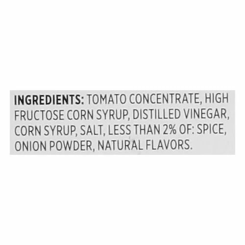 Tomato Concentrate, High Fructose Corn Syrup, Distilled Vinegar, Corn Syrup, Salt, Less than 2% of: Spice, Onion Powder, Natural Flavors.