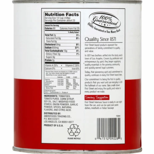Packed fresh. In season . Quality Since 1871. First Street brand products represent five generations of family commitment to quality and value. In 1871 two brothers settled into the dusty ranch town of Los Angeles. Grocers by profession and entrepreneurs by spirit, they began supplying quality essentials to the growing community and quickly earned loyal customers. Today, that pioneering spirit and commitment to quality continues in every First Street brand item. Our commitment to being the first in quality products that you want and use everyday is still the hallmark of our name. Take a walk down First Street and enjoy the quality and value in every product we make. 100% Guaranteed: Quality guaranteed or your money back. Please recycle. Product of USA.