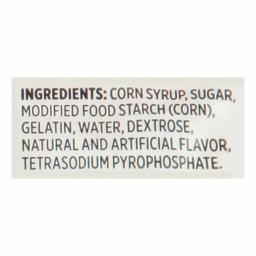 Corn Syrup, Sugar, Modified Food Starch (Corn), Gelatin, Water, Dextrose, Natural and Artificial Flavor, Tetrasodium Pyrophosphate.