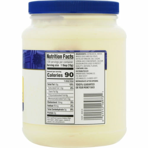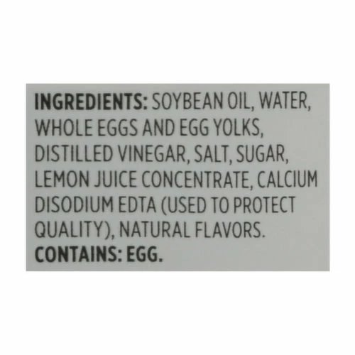 Soybean Oil, Water, Whole Eggs and Egg Yolks, Distilled Vinegar, Salt, Sugar, Lemon Juice Concentrate, Calcium Disodium EDTA (Used to Protect Quality), Natural Flavors.