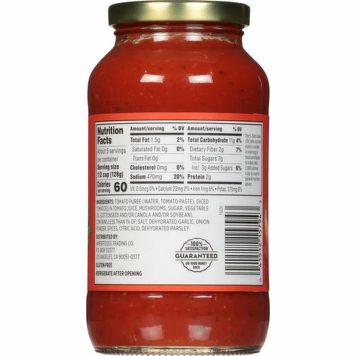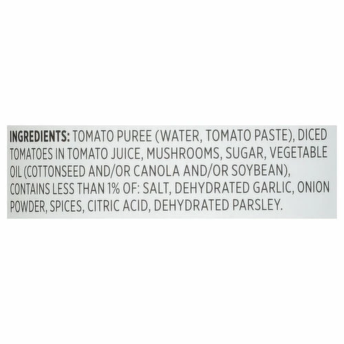 Tomato Puree (Water, Tomato Paste), Diced Tomatoes in Tomato Juice, Mushrooms, Sugar, Vegetable Oil (Cottonseed and/or Canola and/or Soybean), Contains Less than 1% of: Salt, Dehydrated Garlic, Onion Powder, Spices, Citric Acid, Dehydrated Parsley.