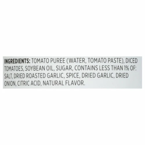 Tomato Puree (Water, Tomato Paste), Diced Tomatoes, Soybean Oil, Sugar, Contains Less than 1% of: Salt, Dried Roasted Garlic, Spice, Dried Garlic, Dried Onion, Citric Acid, Natural Flavor.