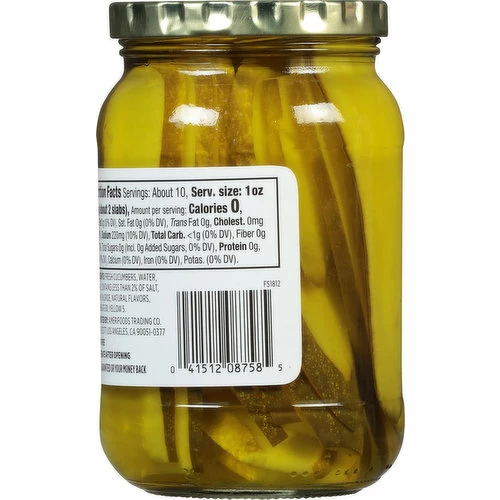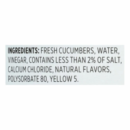 Fresh Cucumbers, Water, Vinegar, Contains Less than 2% of Salt, Calcium Chloride, Natural Flavors, Polysorbate 80, Yellow 5.