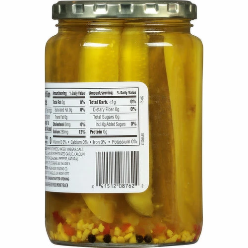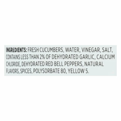 Fresh Cucumbers, Water, Vinegar, Salt, Contains Less than 2% of Dehydrated Garlic, Calcium Chloride, Dehydrated Red Bell Peppers, Natural Flavors, Spices, Polysorbate 80, Yellow 5.