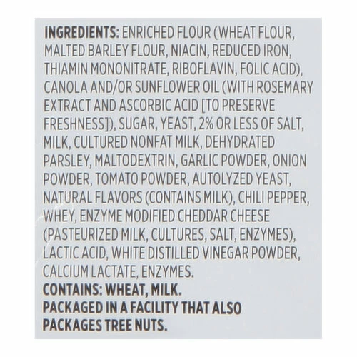Enriched Flour (Wheat Flour, Malted Barley Flour, Niacin, Reduced Iron, Thiamin Mononitrate, Riboflavin, Folic Acid), Canola and/or Sunflower Oil (with Rosemary Extract and Ascorbic Acid [to Preserve Freshness]), Sugar, Yeast, 2% or Less of Salt, Milk, Cultured Nonfat Milk, Dehydrated Parsley, Maltodextrin, Garlic Powder, Onion Powder, Tomato Powder, Autolyzed Yeast, Natural Flavors (Contains Milk), Chili Pepper, Whey, Enzyme Modified Cheddar Cheese (Pasteurized Milk, Cultures, Salt, Enzymes), Lactic Acid, White Distilled Vinegar Powder, Calcium Lactate, Enzymes.