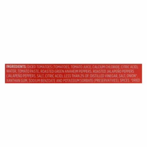 Diced Tomatoes (Tomatoes, Tomato Juice, Calcium Chloride, Citric Acid), Water, Tomato Paste, Roasted Green Anaheim Peppers, Roasted Jalapeno Peppers (Jalapeno Peppers, Salt, Citric Acid), Less than 2% of: Distilled Vinegar, Salt, Onion (Dried), Xanthan Gum, Sodium Benzoate and Potassium Sorbate (Preservatives), Spices.