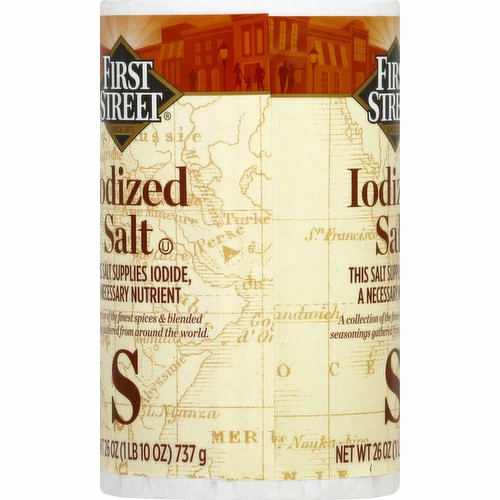 Since 1871. This salt supplies iodide, a necessary nutrient. A collection of the finest spices & blended seasonings gathered from around the world. Welcome to First Street! For over 145 years we have been committed to offering high quality products, at great value, to families and businesses in the communities we serve. Take a walk down First Street and enjoy the wide variety of exclusive we offer. 100% guaranteed on your money back. Recyclable. This entire container is recyclable. Product of USA.